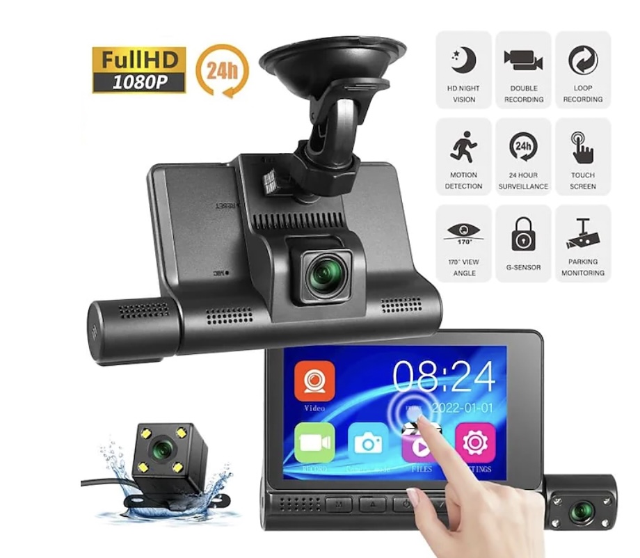 Dash Cam Coche con pantalla táctil de 4 pulgadas, FullHD 1o80P, con sensor de movimiento, visión nocturna y grabación doble.