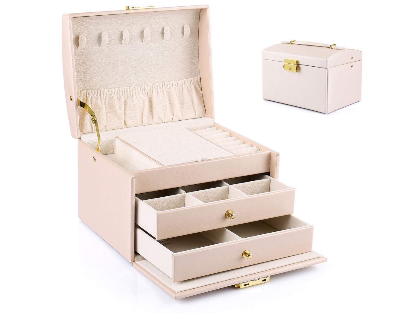 Joyero 3 niveles está hecho de cuero PU de alta calidad y un paño ecológico. Además tiene 2 cajones extraíbles, gran capacidad.
