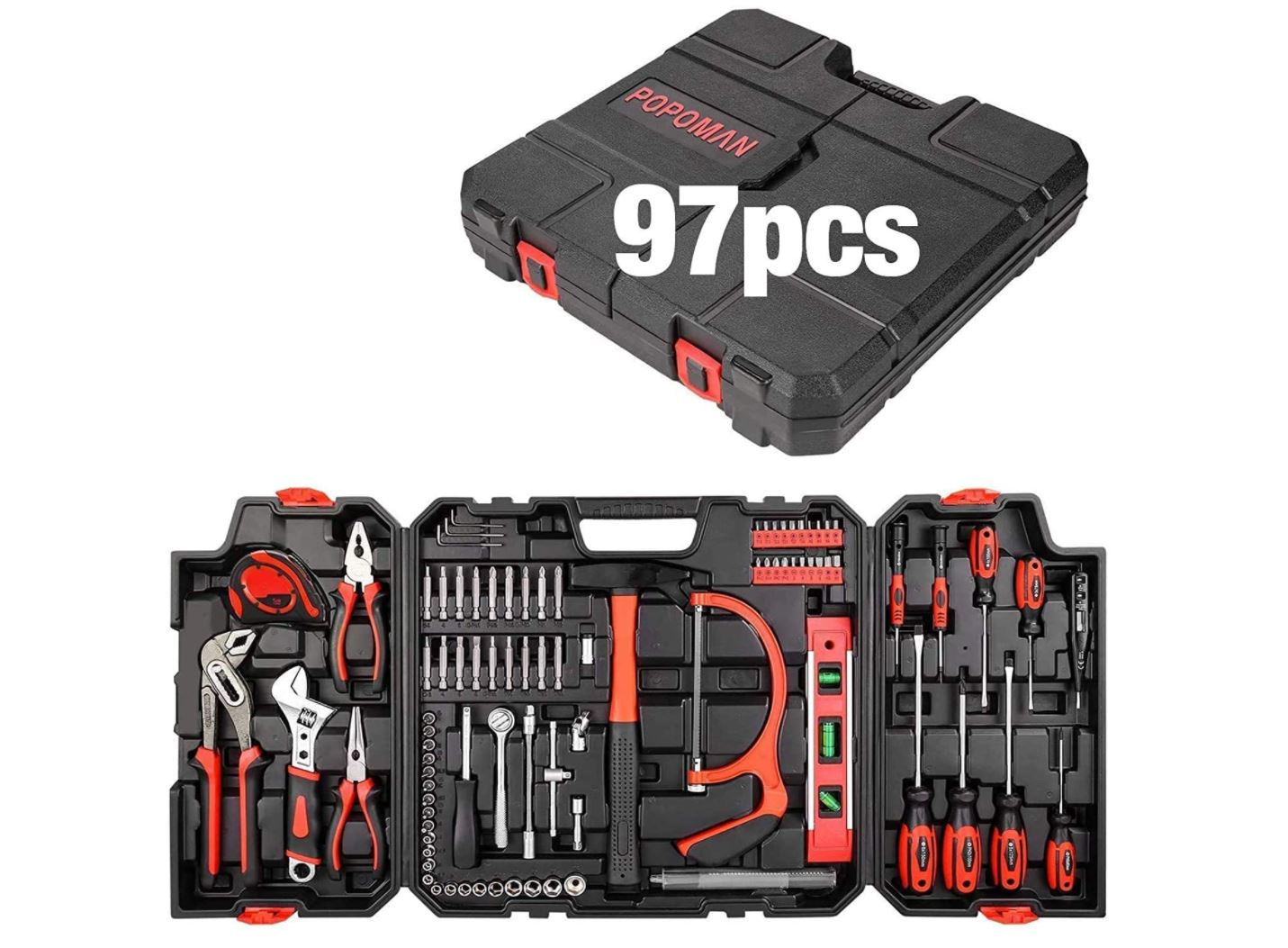 Kit herramientas Popoman THTC02H de 97PCS que incluye alicates de bomba de agua, sierra de aleación de aluminio, llave de trinquete, alicates, nivel espiritual, destornilladores, martillo, etc. Además, viene en una maletín para poder guardar tus herramientas y transportarlas con facilidad.