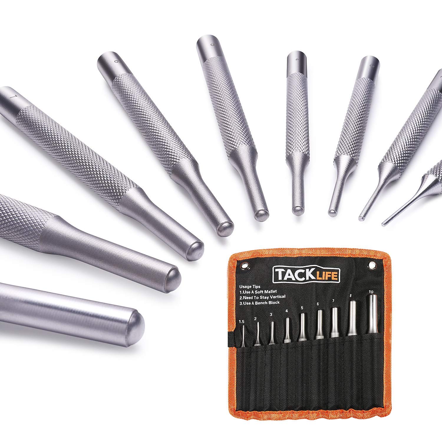 Juego de Botadores Tacklife fabricados con acero de vanadio y cromo de alta calidad 50. Este juego de punzones de 9 piezas viene con una bolsa de almacenamiento enrollable negra.
