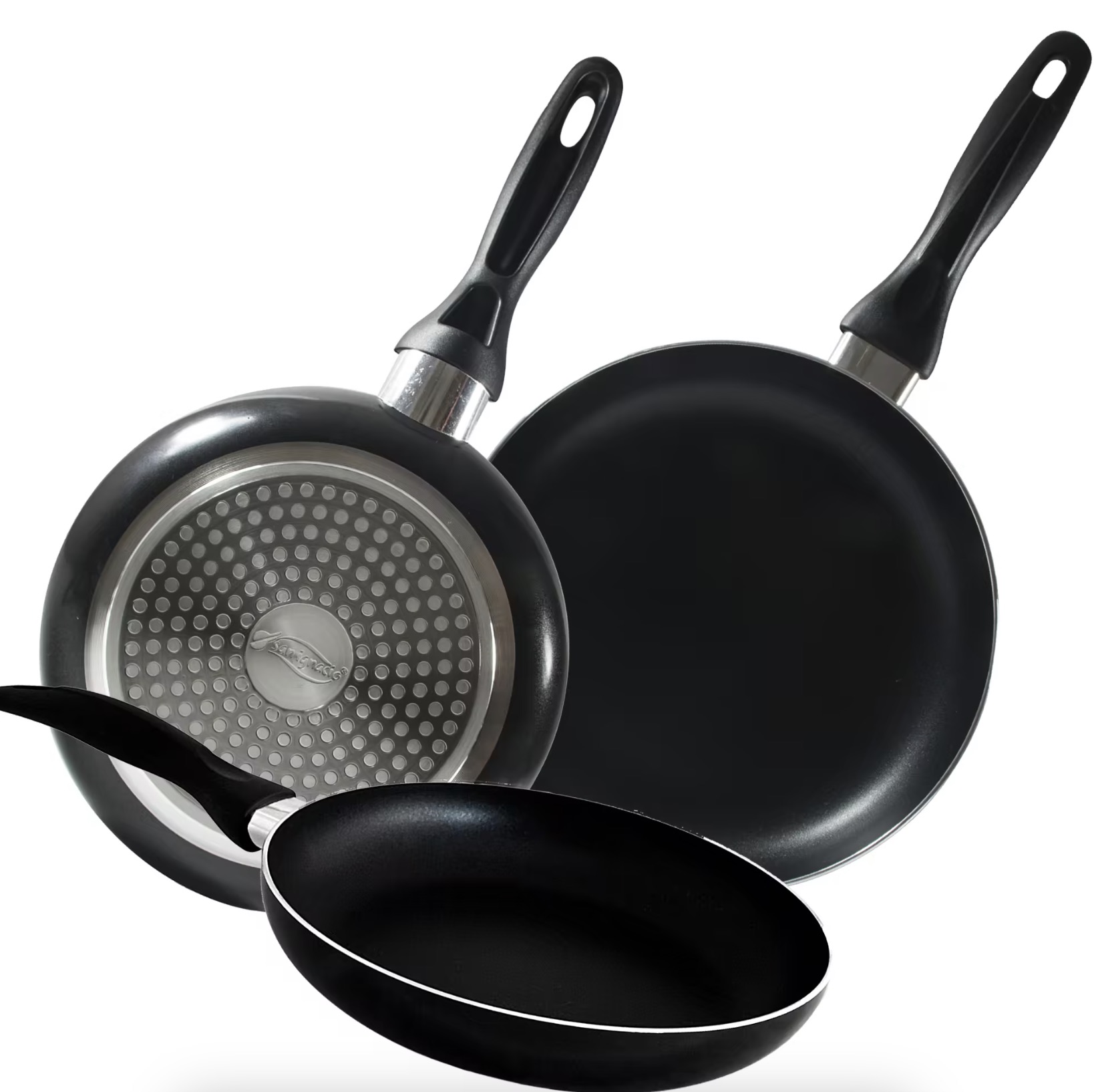Pack de 3 sartenes San Ignacio, compatibles con todo tipo de cocinas, induccion incluido, medidas 16, 20 y 24cm. Interior con recubrimiento de mármol y exterior resistente a altas temperaturas.