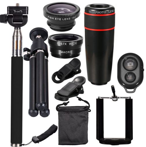 Pack accesorios fotografia que cuenta con 8X Teleobjetivo, Lente teléfono, Gran angular Lente, Selfie Stick, Trípode.