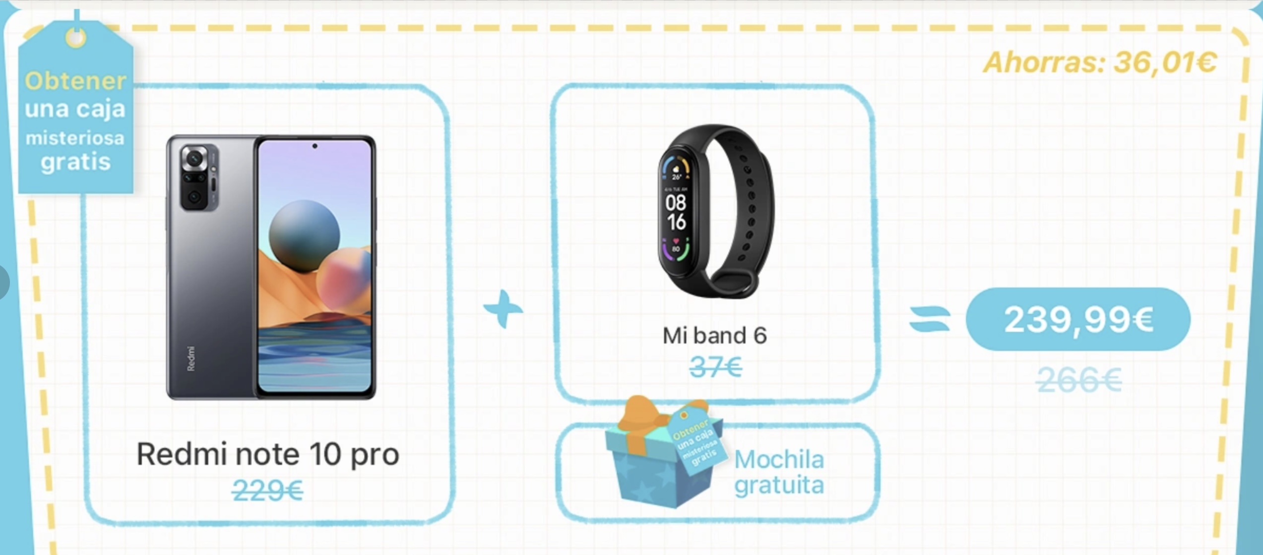 Redmi Note 10 Pro + Mi band 6, el smartphone con capacidad 6/64GB, y de regalo una mochila. Además, podrás obtener una caja misteriosa gratis si eres de los 1000 primeros pedidos. Envío desde ESPAÑA.