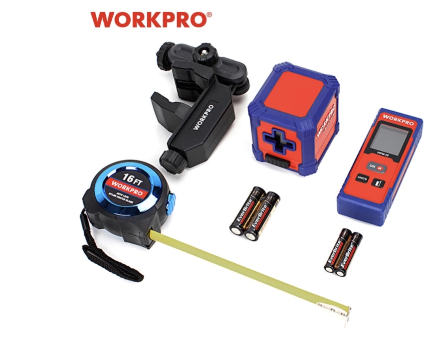 Set de 3 herramientas de medida WorkPro tiene telémetro láser de 20M, un nivel láser de enlace cruzado con soporte y una cinta métrica de 5M.