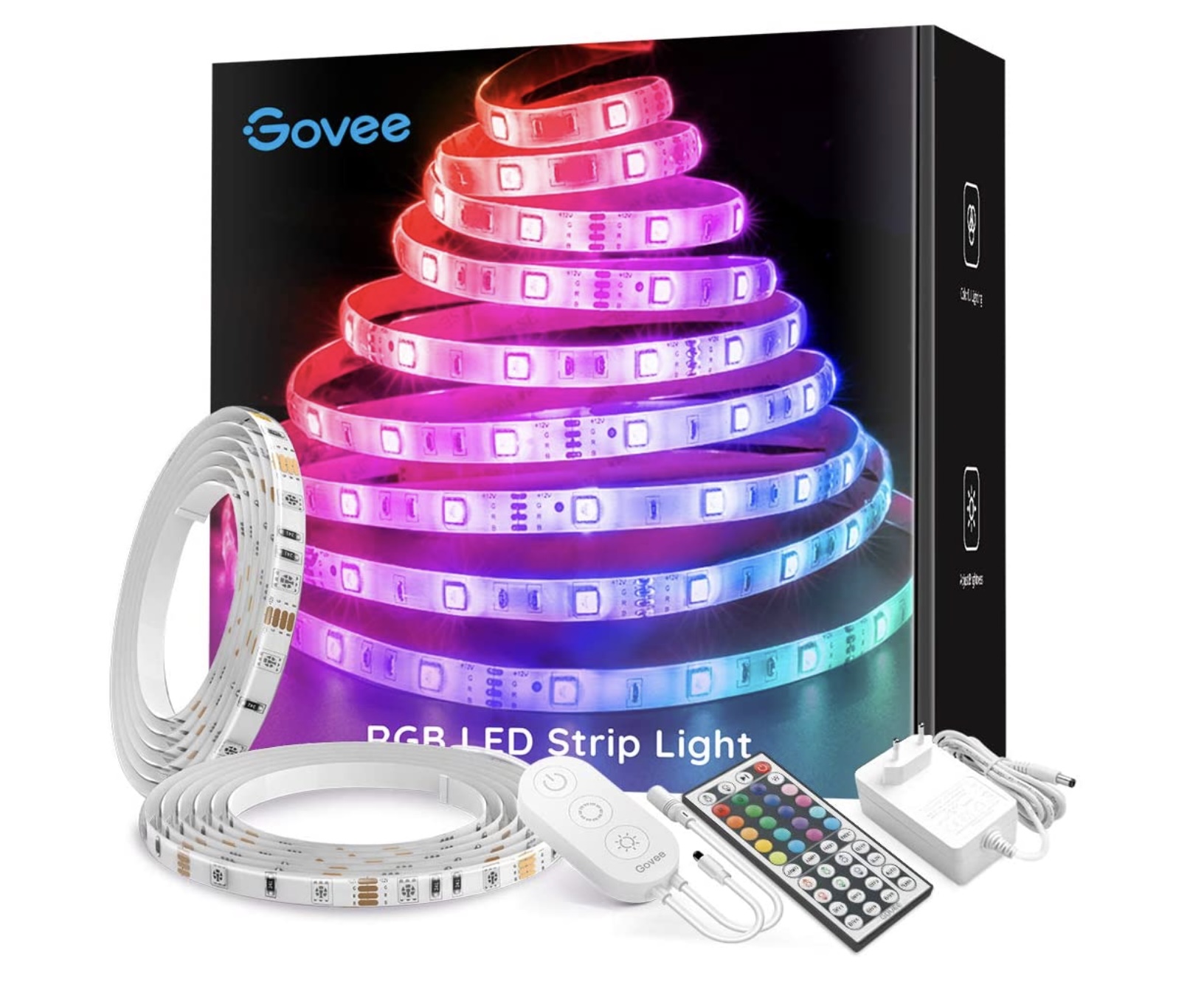 Tira LED 10M Govee RGB de SMD 5050 proporciona 20 colores básicos, 5 niveles opcionales de brillo y 9 modos de iluminación, tiene control de remoto de 44 botones y caja de control de 3 botones.